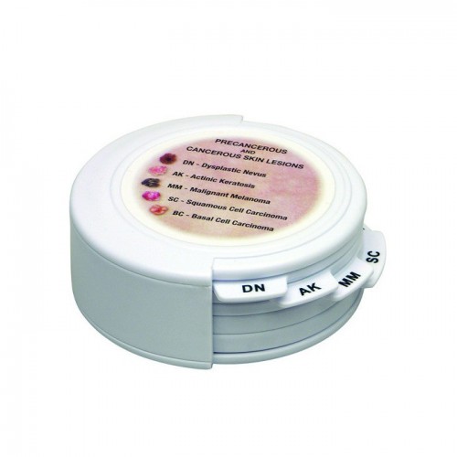 Model presents full size and enlarged views of dysplastic nevus, actinic keratosis, malignant melanoma, squamous cell carcinoma, and basal cell carcinoma skin lesions. Each disk has a 3-dimensional surface to help demonstrate the skin condition. Back side of disk presents additional lesion information.